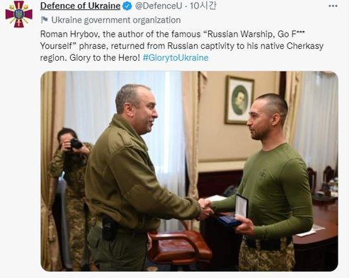 (서울=연합뉴스) 김태종 기자 = 러시아군의 투항 요구에 욕설을 섞어 "꺼져라"라고 답했다가 붙잡힌 우크라이나 병사가 정부 훈장을 받았다.