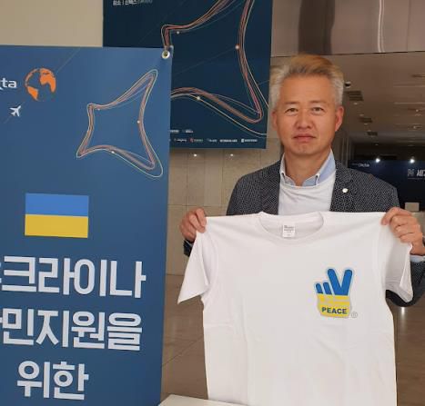 우크라이나 난민 지원을 위한 티셔츠를 판매하는 남종석 폴란드 한인연합회장 |