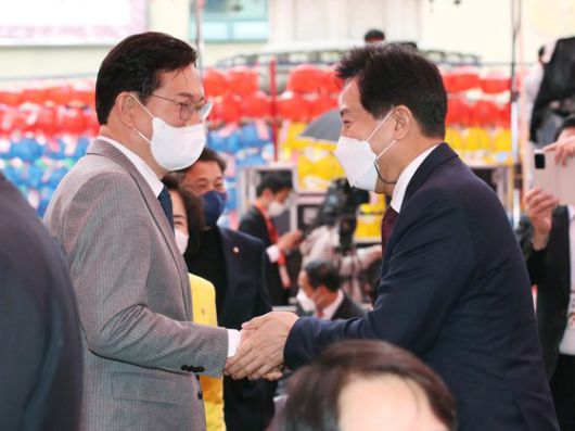 오세훈 서울시장(오른쪽)과 더불어민주당 송영길 전 대표가 30일 서울 종로구 조계사에서 열린 대한불교조계종 제15대 종정 중봉 성파 대종사 추대법회에서 인사하고 있다. 연합뉴스 |