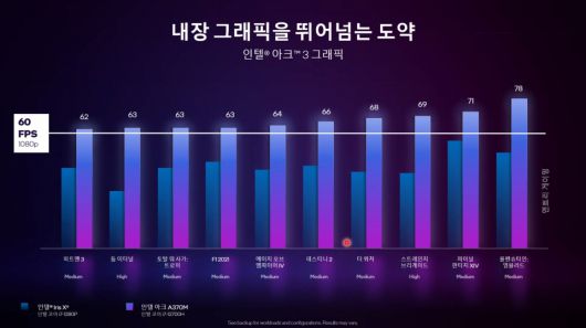 - 인텔 아크3 그래픽은 향상된 1080p 게이밍 및 더욱 강화된 콘텐츠 제작 경험을 제공한다. 아크 A370M 기반 노트북은 다양한 인기 게임 타이틀을 1080p 해상도에서 초당 60프레임 이상 구동할 수 있다.