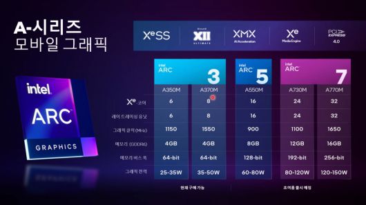인텔 아크 A시리즈 그래픽은 폭넓은 노트북 설계를 지원하며 아크3 그래픽 제품 초기 물량의 대부분은 인텔 이보 인증 노트북에 탑재될 예정이다. 여기에는 초박형 노트북용 A350M과 씬앤라이트 노트북에서 좀 더 고성능을 지원할 A370M 등 2개 제품이 포함된다.