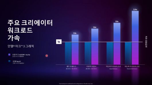 - 아크5 및 아크7 그래픽은 향상된 그래픽 및 컴퓨팅 성능과 함께, 동일한 최첨단 콘텐츠 제작 성능을 제공한다. 해당 제품은 아크3 제품 대비 더 많은 Xe 코어와 레이 트레이싱 유닛, GDDR6 메모리를 탑재하고 있다.