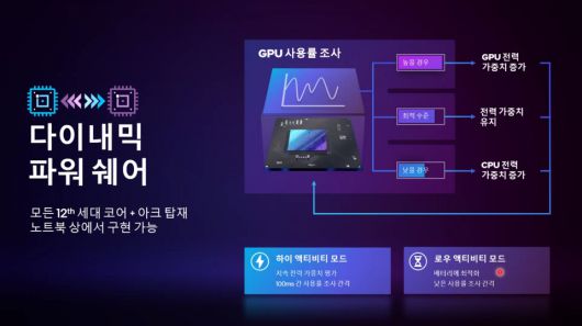 - 다이내믹 파워 쉐어(Dynamic Power Share) – 다이내믹 파워 쉐어는 필요에 따라 인텔 코어 프로세서 또는 인텔 아크 그래픽 제품에 더 많은 전력을 공급해, 워크로드에 따라 엔진 성능을 자동적이고 지능적으로 우선순위를 지정할 수 있도록 지원한다. 이를 통해 콘텐츠 제작 워크로드 또는 컴퓨팅 부하가 높은 애플리케이션 성능이 최대 30% 향상된다.