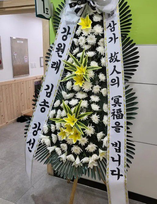 이어 "(요양병원에서) 폐렴이 걸려 확인해보니 코로나 양성반응 받고 그날로 하늘나라로 떠났다"며 "가족들은 임종도 못 지켰고 입관식도 못했다. 삼가 고인의 명복을 빈다"고 애도했다. 공개된 사진에는 강원래, 아내 김송, 아들 강선의 이름이 쓰여진 조화가 빈소 앞에 놓여져 있다.