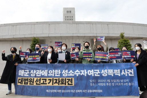 ‘해군 상관에 의한 성소수자 여군 성폭력 사건’ 공동대책위원회가 31일 오후 서울 서초구 대법원에서 열린 상고심이 끝난 뒤 가해자에 대한 징계를 요구하는 기자회견을 하고 있다. (사진=연합뉴스) |