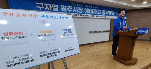 더불어민주당 소속 구자열 원주시장 예비후보는 31일 원주시청 지하 1층 다목적 홀에서 공약 발표를 통해 신종 코로나바이러스 감염증(코로나19) 피해를 본 소상공인과 자영업자들이 회복할 수 있도록 3천억 원 규모의 금융지원을 약속했다.