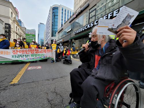 박경석 전국장애인차별철폐연대(전장연) 상임공동대표는 이날 오후 여의도 이룸센터 앞에서 열린 '장애인교육권 완전보장을 위한 장애인들의 행진' 집회에 참석해 이같이 밝혔다.