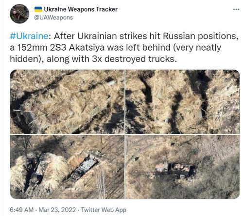 이외 다른 영상에서도 러시아군은 장갑차 위에 마른 건초 같은 것을 널어놓거나, 러그나 무거운 천 등을 덮어놓은 모습이 포착됐다. 탱크가 도로를 벗어나 나무숲 사이에 숨어있는 모습도 찍혔다.