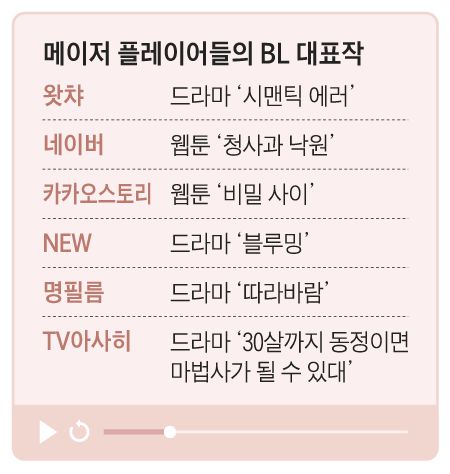 일본에서는 지상파 TV아사히에서도 나온다. 국내에서 BL은 과거 10대 아이돌그룹 팬들이 멤버를 짝지어 만들던 팬픽(팬 창작물) 문화와 얽혀 있다. ‘덕통사고’라는 말을 아시는지. 덕질을 하다 크게 빠져드는 것을 일컫는데 BL이 딱 그런 장르다. 아이돌 출신 배우들의 수려한 외모, K콘텐츠의 인기에 더불어 ‘K-BL’ 잠재력도 있다는 평이다. 충성도 높은 팬들이 소셜미디어에서 자발적으로 콘텐츠를 생산하고 관여한다. 포토에세이, OST, 굿즈 등 2차 부가 시장도 전망이 밝다.