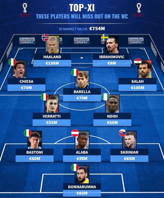 그러면서 월드컵 출전이 불발된 선수들도 생겼다. 축구 통계 매체 '트랜스퍼마크트'는 월드컵에 나가지 못하는 주요 선수들을 포지션별로 정리해 베스트 일레븐을 꾸렸다. 11명의 몸값 합은 무려 7억 5,400만 유로(약 1조 156억 원)였다. 몸값 높은 선수들이 월드컵에 나가지 못한다는 걸 보여주는 부분이었다.