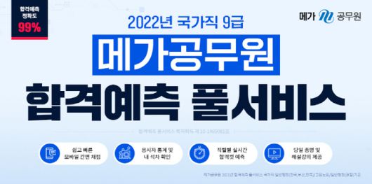 메가공무원 합격예측 풀서비스는 2022 9급 국가직 공개 경쟁 시험 행정직군 및 기술직군에 응시한 수험생이면 누구나 무료로 이용할 수 있다. 메가공무원 합격예측 풀서비스와 관련된 자세한 내용은 메가공무원 홈페이지에서 확인 가능하다.