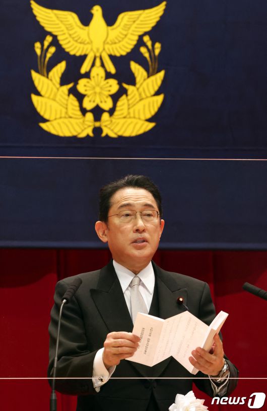 기시다 후미오 일본 총리가 27일 요코스카 군사학교 졸업식에서 연설하고 있다. © AFP=뉴스1 |