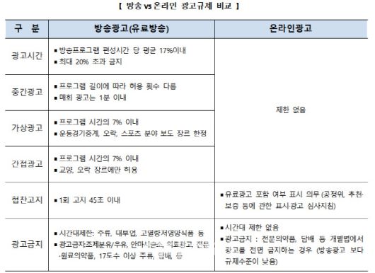 이날 유료방송 업계는 온라인 광고 대비 많은 규제를 적용받고 있는 불공정 경쟁 환경을 해소해줄 것을 제언했다. 유료방송 광고는 현재 광고시간, 중간광고, 가상광고, 간접광고 등 촘촘한 규제를 적용받고 있다는 입장이다. 이들은 방송광고 규제를 네거티브 규제로 전환하고 완전총량제 도입을 주장했다.