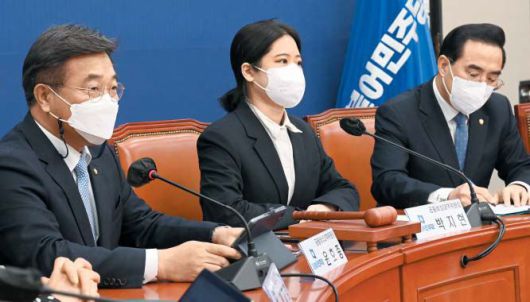 민주당 윤호중 비상대책위원장(왼쪽)이 1일 국회에서 열린 당 회의에서 발언하고 있다. 가운데는 박지현 공동비상대책위원장, 오른쪽은 박홍근 원내대표. /연합뉴스 |