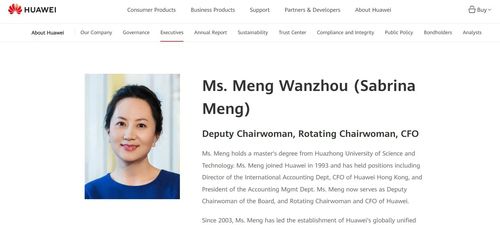2일 화웨이 홈페이지의 경영진 소개 항목에 따르면 멍완저우의 직책은 부회장, 순회 회장, 최고재무책임자(CFO)로 적시돼 있다.
