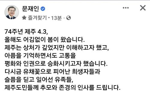 (서울=연합뉴스) 임형섭 기자 = 문재인 대통령은 3일 '제 74주년 제주 4·3 희생자 추념일'을 맞아 "5년 내내 제주 4·3과 함께해 왔던 것은 제게 큰 보람이었다"며 "언제나 제주의 봄을 잊지 않겠다"고 말했다.