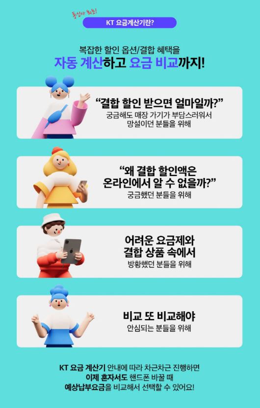 KT 고객경험혁신본부 박효일 상무는 “요금계산기는 전문 상담사 상담 전 또는 온라인 셀프 가입을 위해 요금설계나 요금시뮬레이션을 해보고 싶은 고객의 니즈를 맞춰 드리고자 준비했다”고 말했다.