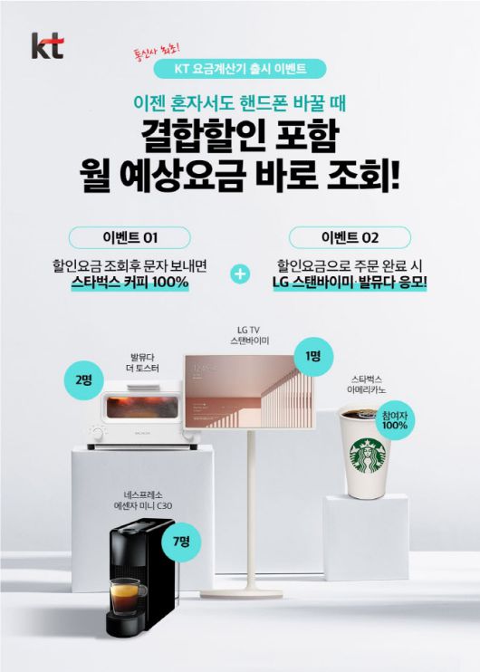 신규 서비스를 출시하며 KT는 다소 생소할 수 있는 요금계산기 서비스를 고객이 직접 이용해볼 수 있도록 출시 이벤트도 진행한다. 4월 1일부터 4월 15일까지 요금계산기를 통해 온라인 단말 주문을 완료한 고객을 대상으로 LG 스탠바이미, 발뮤다 등 인기 가전을 추첨해 제공하는 이벤트를 진행한다. 4월 30일까지 요금계산기로 휴대폰 예상 납부 요금을 문자 발송한 이벤트 응모 고객에게는 스타벅스 쿠폰을 지급하는 이벤트도 진행한다. 단, 스타벅스 쿠폰은 선착순 지급으로 물량 소진 시 조기 종료 될 수 있다.
