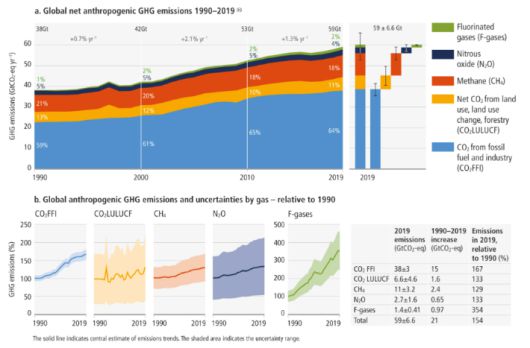 이번 보고서의 핵심 내용은 '정책결정자를 위한 요약본'(SPM)에 담겼다. 이에 따르면 2010~2019년 전 지구의 순 인위적 온실가스 배출 총량은 지속 증가했다. 이 기간 누적 CO2 배출량은 410±30 GtCO2로 1850~2019년 누적 배출량(2400±240 GtCO2)의 17%에 달했다.