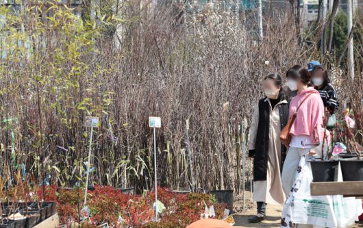 식목일을 하루 앞둔 지난 4일 완연한 봄 날씨를 보인 가운데 서울 서초구 양재동 화훼공판장에서 시민들이 묘목을 고르고 있다. 연합뉴스 |
