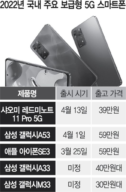 중국의 샤오미가 30만 원 대 5세대 이동통신(5G) 스마트폰을 국내에 선보이며 갤럭시와 경쟁을 선언했다. 애플 아이폰SE 3세대는 물론 출시를 앞둔 갤럭시A33·M33도 5G 본격 지원에 나서며 올해 ‘보급형 5G’ 시대가 열릴 것이라는 전망이 이어진다.