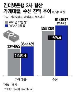 5일 은행권에 따르면 카카오뱅크·케이뱅크·토스뱅크의 지난달 말 기준 합산 가계대출 잔액은 36조1439억원으로 나타났다. 지난해 말(33조4829억원)과 비교해 2조6610억원(7.9%) 증가한 규모다. 특히 토스뱅크의 가계대출 잔액이 1분기 동안 1조8373억원 늘면서 증가세를 주도했다. 카카오뱅크와 케이뱅크는 1037억원, 7200억원씩 증가했다.