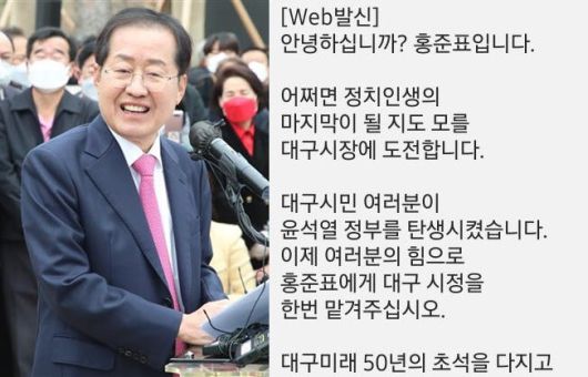 [이데일리 송혜수 기자] 대구시장 선거에 뛰어든 홍준표 국민의힘 의원이 대구시민들에게 지지 호소 문자를 보내면서 정치인생의 마지막 도전이라는 언급을 했다.