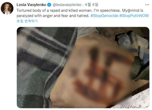 지난 4일(현지시간) 영국 일간 데일리메일에 따르면 우크라이나 홀로스당 소속 여성 하원의원인 레시아 바실렌코는 자신의 트위터에 ‘강간과 고문을 당한 뒤 살해된 여성’이란 글과 함께 사진 한 장을 공유했다.