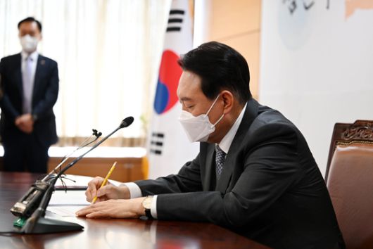 윤석열 대통령 당선인이 5일 오전 서울 종로구 통의동 대통령직인수위원회에서 열린 간사단회의에서 참석자들의 발언을 메모하고 있다. /사진=뉴스1 |