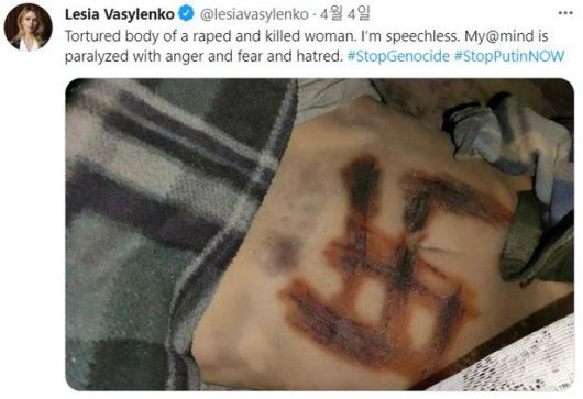 5일(현지시각) 미국 뉴욕포스트 등 외신에 따르면 우크라이나 레시아 바실렌코 의원은 자신의 트위터에 “강간당한 뒤 고문, 살해된 여성의 시신”이라며 사진 한 장을 올렸다. 몸에 스바스티카이가 선명하게 새겨져 있다.