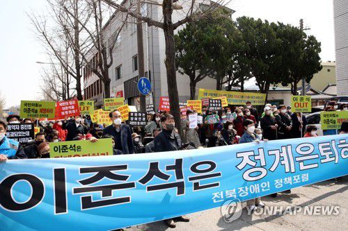 (전주=연합뉴스) 나보배 기자 = 전북장애인정책포럼은 지하철 시위에 나선 전국장애인차별철폐연대를 비판한 국민의힘 이준석 대표를 향해 "혐오를 일삼는 이 대표는 사퇴하라"고 촉구했다.