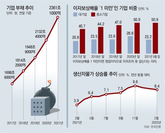 기업 빚이 역대 최대로 불어난 가운데 원자재 가격 폭등과 금리 인상의 이중고를 떠안은 중소기업의 부실이 본격화될 수 있다는 우려가 커지고 있다. 한국 경제의 뿌리 역할을 하는 중소기업이 흔들리면 고용 및 금융시장의 연쇄 충격이 불가피하다는 지적이 나온다.
