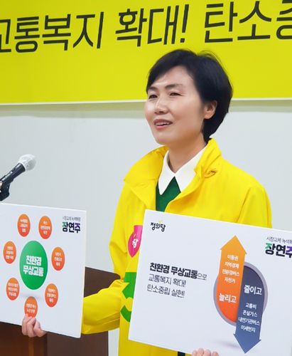 (광주=연합뉴스) 장덕종 기자 = 장연주 정의당 광주시장 예비후보는 7일 광주시의회에서 기자회견을 열고 '친환경 무상교통' 공약을 발표했다.