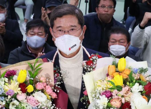 경기 안성 국회의원 재선거 김학용 국민의힘 후보가 9일 오후 경기도 안성시 공도읍 선거사무소에서 당선이 확실시되자 꽃다발을 들고 기뻐하고 있다. [이미지출처=연합뉴스] |
