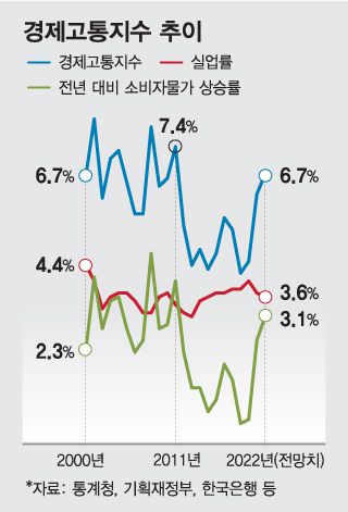 문재인 정부 마지막 해이자 윤석열 정부 첫 해인 올해 경제고통지수(소비자물가 상승률+실업률)가 7% 선에 육박하며 11년 만에 최고치를 기록할 것으로 보인다. 러시아-우크라이나 간 전쟁 등으로 물가가 큰 폭으로 뛴 가운데 코로나19(COVID-19) 장기화로 고용시장 개선도 늦어진 탓이다.