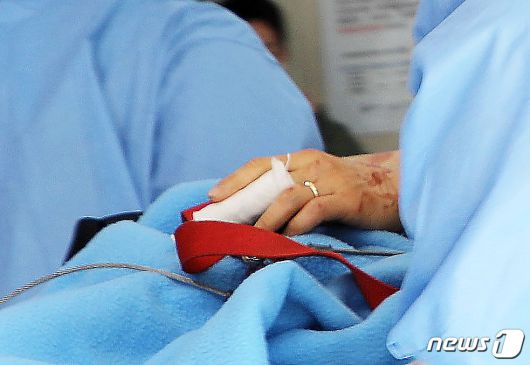제주 해상 해경 헬기 추락사고 생존자인 기장 A경감(47)이 8일 오전 제주시 연동 제주한라병원 권역외상센터로 옮겨지고 있다. 현재 A경감은 다발성 골절을 입었으나 생명에 지장은 없는 상태다. 해경에 따르면 이날 오전 1시32분쯤 제주 서귀포시 대정읍 마라도 남서쪽 약 370㎞ 해상에서 남해지방해양경찰청 항공대 소속 헬기(S-92)가 추락해 현재 2명이 사망하고 1명이 실종됐다. 2022.4.8/뉴스1 © News1 오미란 기자