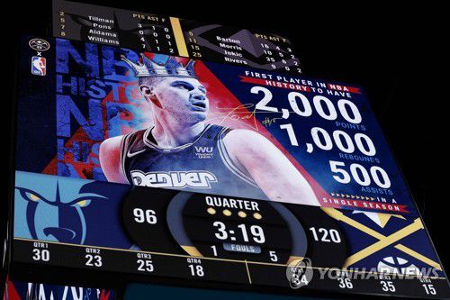 NBA 최초로 단일 시즌에 2천 득점·1천 리바운드·500어시스트 이상을 모두 기록한 덴버의 요키치의 기록이 전광판에 표출되고 있다. [USA TODAY Sports=연합뉴스] |