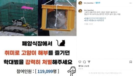 김 여사는 9일 자신의 인스타그램 계정에 '고양이 학대범 강력처벌'을 요청하는 청와대 청원을 올렸다. 이 게시물은 "폐양식장에서 취미로 고양이 해부를 즐기던 학대범을 강력히 처벌해달라"는 내용이다.