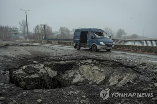 러시아 군의 포격으로 파손된 마카리우의 도로 |