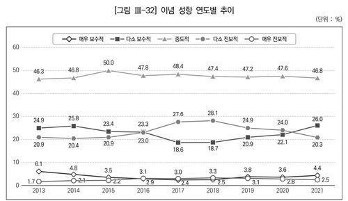 보수 성향이 진보 성향보다 많은 것은 지난 2016년 조사 때(보수 26.2%·진보 26.1%) 이후 처음이다.