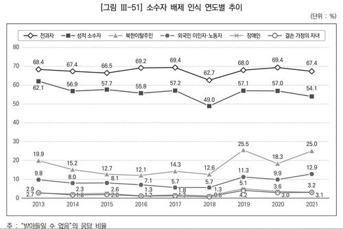 ◇ "탈북자 못받아들여" 4년새 '14.3%→25.0%'…성소수자 배제 수준 '제자리'