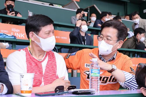 10일 한화생명 이글스파크에서 만난 허태정 대전시장(오른쪽)과 허구연 KBO 총재 |