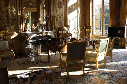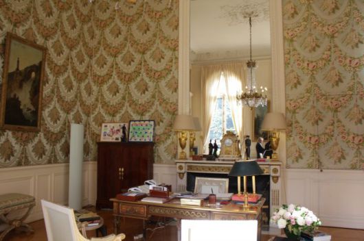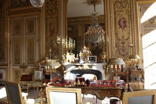 샹들리에가 빛을 비추고 있는 대통령의 책상은 엘리제 궁의 최고 보물로 꼽힌다. 18세기 가구장식가 샤를 그레상이 루이 15세를 위해 제작한 이 책상이다. 책상에는 필기도구와 촛대모양의 등이 놓여 있었다. 발레리 지스카르 데스탱 전 대통령 시절에는 이 방을 집무실로 사용하지 않았다. 왕실풍이 공화국의 정신과 어울리지 않는다고 여겼기 때문이다.