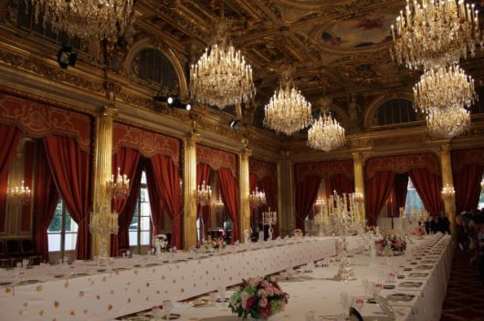 건물 1층에는 국가 공식 연회나 만찬이 열리는 ‘살 데 페트(Salle des Fete)’가 있다. 화려한 천장화와 샹들리에, 태피스트리로 꾸며진 연회장이다. 1889년 파리 만국박람회 당시 조성된 이 연회장은 붉은색과 황금색 컬러로 디자인 돼 있다.