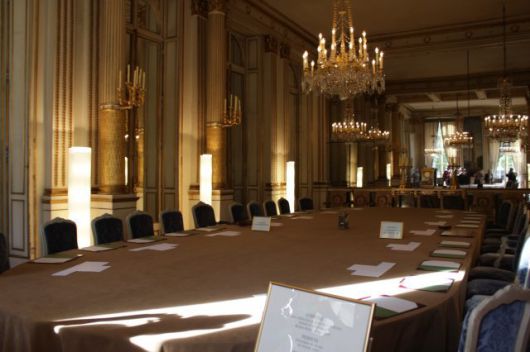 1층 ‘살롱 뮈라(Salon Murat)’에서는 매주 수요일 장관들이 참여하는 국무회의가 열린다. 원형 탁자에 대통령과 장관들이 둘러앉고 엘리제 궁 비서실장과 총리비서실장이 따로 창가 쪽에 자리 잡고 앉는다. 별로 크지 않은 방이어서 내각 장관들이 어깨를 부딪칠 정도로 앉아서 회의를 하는 모양이 그려진다. 탁자에 마이크 시설은 없었다. 육성으로도 충분히 소리가 들릴만한 방이기 때문이다.