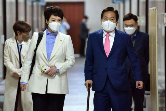 심재철 전 국회부의장(오른쪽)과 김은혜 의원이 지난 8일 국회에서 국민의힘의 전국 동시 지방선거 광역단체장 공천 신청자 면접에 참석하러 이동하고 있다. 공동취재 사진 |