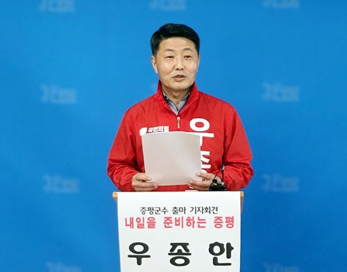 우 의원은 12일 군청 브리핑룸에서 기자회견을 열어 "말보다 행동으로 보여주는 실천력, 군민과의 약속은 반드시 지켜내는 책임감, 증평을 풍요로운 도시로 발전시키겠다는 사명감으로 이 자리에 섰다"며 출마의 변을 밝혔다.