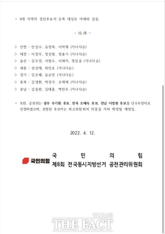 국힘 공관위는 선정한 후보자를 최고위원회 의결을 거쳐 확정할 예정이다.