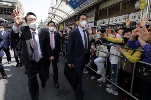 윤석열 대통령 당선인이 12일 대구 중구 서문시장을 방문해 환영을 나온 시민에게 손을 들어 인사하고 있다. (사진=뉴시스) |