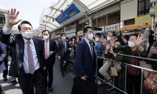 첫 지역 순회 일정으로 대구·경북(TK) 지역을 방문 중인 윤석열 대통령 당선인이 12일 대구 중구 서문시장에서 환영 인파에 손을 흔들고 있다. 대구=인수위사진기자단 ⓒ 세상을 보는 눈, 세계일보